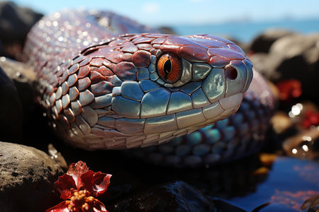 Serpent basking on rock intricate scales gleaming natural habitat setting golden hour glow wide angle view