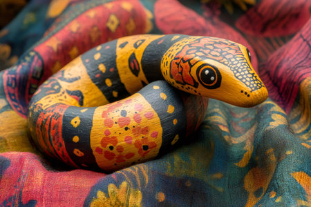 Wooden snake toy with colorful painted patterns resting on a patterned fabric, representing wildlife, art, and craft