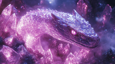 Glowing purple snake emerging from crystal cave