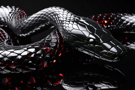 Close-up of a black snake on a black background with reflection