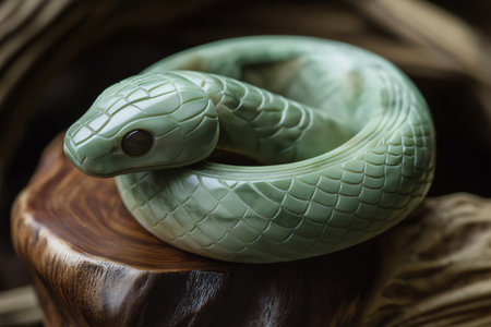 Beautifully crafted green wooden snake sculpture is resting on a wooden stand, its intricate details highlighted by the warm lighting