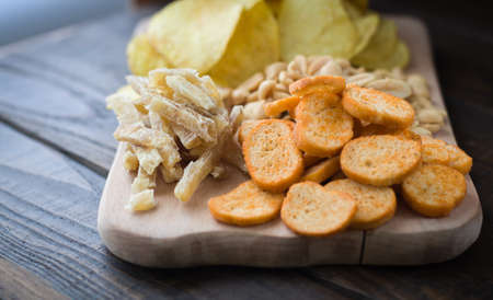 Snacks for beer on the table in the pub. Peanuts, pieces of fish, crackers, chips. close-up