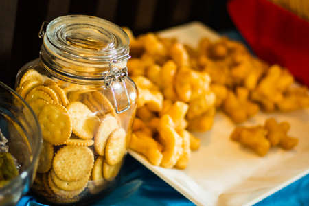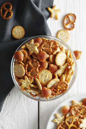 Salty snacks. Crackers, pretzel, salted straws, nuts. Junk food for beer or cola. Photographed with natural light.
