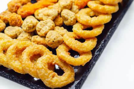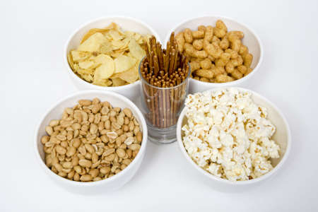 Portion of mixed Snacks isolated on white background (detailed close up shot; selective focus)