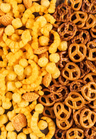 Salty snacks. Pretzels, chips, crackers and candy sweets. Unhealthy products. food bad for figure, skin, heart and teeth. Assortment of fast carbohydrates food.