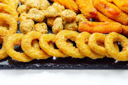 Southern fried and roast chicken bites, onion rings and mozzarella stick served on the stone plate, party bites, buffet