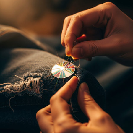 A skilled hand deftly sews a button onto dark fabric, showing the intricate stitching and care in garment repair.