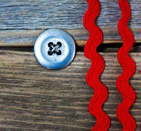 vintage button and old three red tape on a textured surface aged boards.