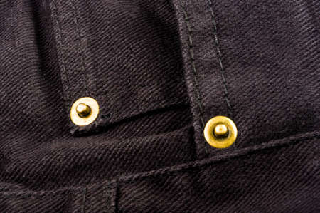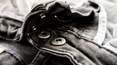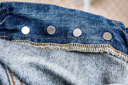 clothing items washed cotton fabric texture with seams, clasps, buttons and rivets, macro, close-up
