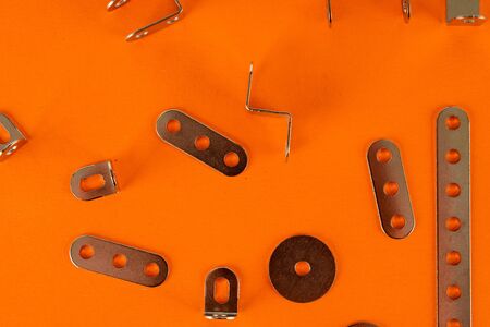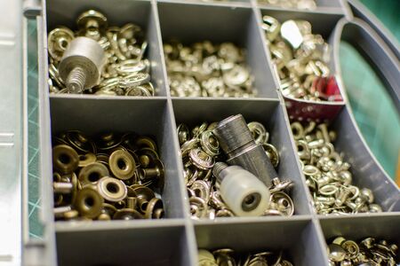 closeup heap of metal fittings, material for handicraft leather working and garment.