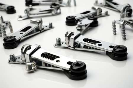 A visually striking assortment of various fasteners, screws, nuts, and other metal components arranged artfully on a dark background, perfect for industrial themes.