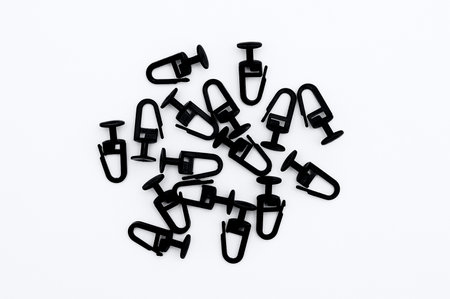 Black plastic hooks for curtain rod for hanging curtains in bulk. White background.