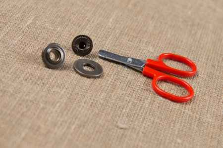 Details of the button and small scissors on the burlap.