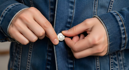 A close-up view of hands carefully fastening a metal button on blue denim fabric, focusing on the intricate details of the adjustment clothing process.