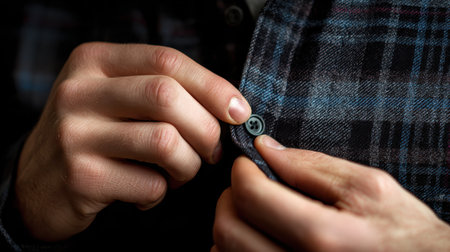 Close-Up of Hands Buttoning a Flannel Shirt with Stylish Patterns and Textures in a Soft Lighting Environment