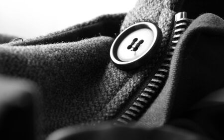 Detailed close-up of a button and zipper on textured fabric. This image showcases the craftsmanship and design of clothing accessories, highlighting their elegance and functionality.