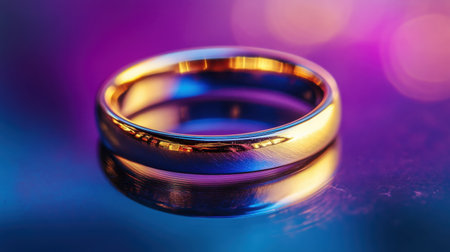 A stunning close-up image of a gold wedding ring showcasing its elegance. The vibrant colorful background enhances the ring's shine.