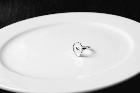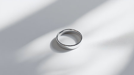 A striking silver ring positioned against a soft background, illuminated by gentle light shadows, capturing elegance and minimalism in jewelry design.