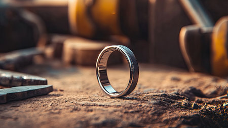 A beautifully crafted silver ring rests on a rustic workbench, illuminated by warm natural light, showcasing its intricate details and elegance.