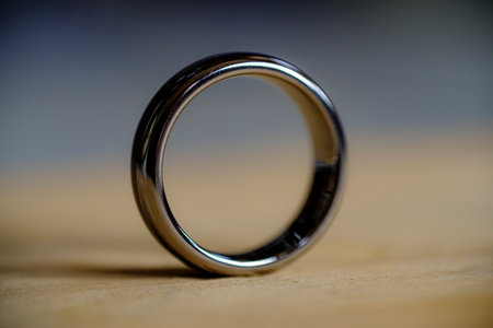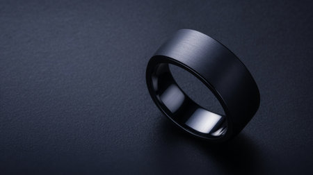 Stylish black ring resting on a smooth surface illuminated softly
