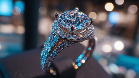 Exquisite diamond ring shining brilliantly on display, a symbol of luxury and love.