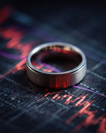 A silver ring is placed on a dark surface overlaid with blurred lines in shades of red and purple. The composition has a shallow depth of field, focusing on the ring. The image suggests a business or economic context, suitable for various commercial applications.