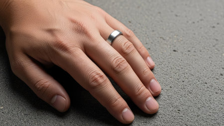 Close up of a hand wearing a stylish black metal ring with a brushed finish, showcasing contemporary jewelry design
