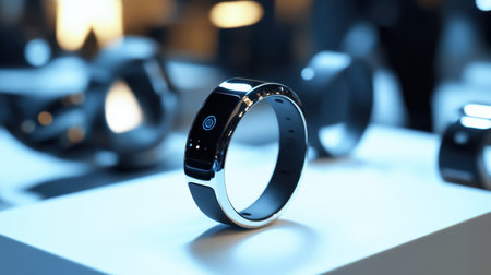 A modern, minimalist smart ring designed for health tracking and connectivity, presented in a clean studio setting with a soft, diffused light