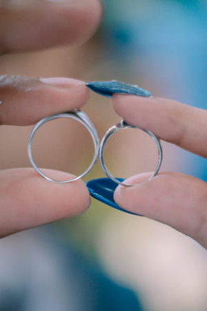 A wedding ring held between the fingers of a newlywed couple, symbolizing their eternal love and commitment.