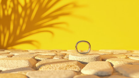 An elegant silver ring rests on a textured stone pedestal, dramatically contrasted against a vibrant yellow background. The ring, likely for engagement or wedding, catches the sunlight, casting a delicate palm shadow on the surface. This modern and minimalist image highlights the jewelry's beauty and refined design. Perfect for use in fashion or luxury marketing, showcasing accessories, product displays, and representing style and beauty.
