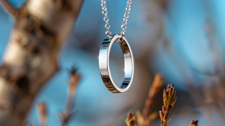A stunning close-up of a silver ring gracefully hanging from a chain amidst budding tree branches, showcasing elegance and simplicity in nature.