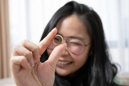 Close up to Beautiful glasses Asian woman is playing the golden ring in her bedroom
