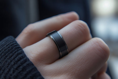 Futuristic glowing smart ring on finger highlights wearable tech blending style innovation and subtle biometric data monitoring.