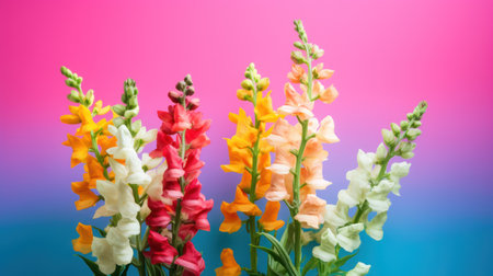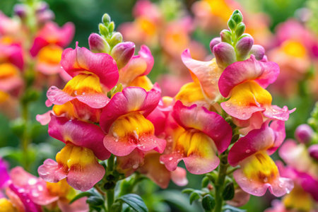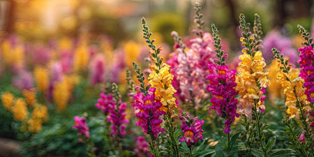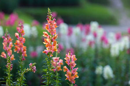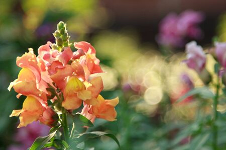 Vivid pink, yellow and orange dragon flowers or snapdragons or Antirrhinum in a sunny spring garden, beautiful outdoor floral background photographed with soft focus