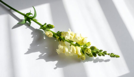 snapdragon stem laid diagonally on white raking light petal texture minimal botanical profile with open copy space