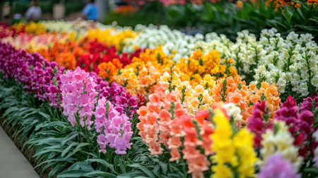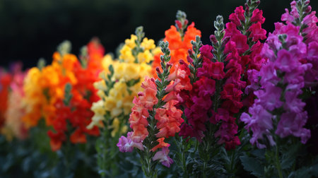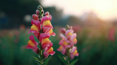 A stunning close-up of vibrant snapdragons blooms radiating colors in a lush flower field during sunset, capturing the essence of spring and natural beauty.