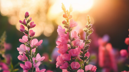 Beautiful pink flowers bloom in a garden during sunset, capturing the vibrant colors of nature in the golden hour