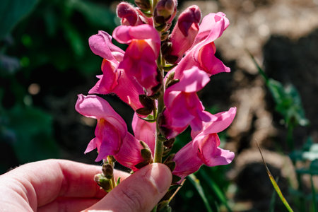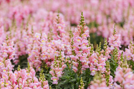 Snapdragon flowers in the garden, antirrhinum majus, pink flower head and blurred background