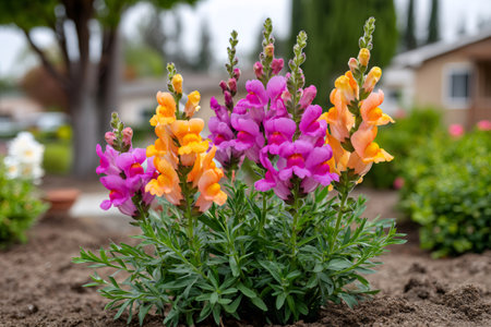 Bright orange and yellow snapdragon flowers blossom in a vibrant garden, adding beauty to the spring landscape with their rich colors and delicate petals.