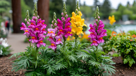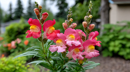 Pink and yellow snapdragon flowers standing tall and vibrant in a blooming outdoor garden