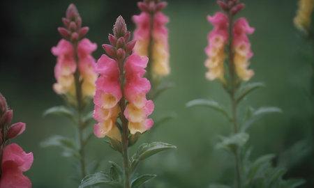 A close-up view of vibrant snapdragons showcasing pink and yellow petals against a soft green backdrop. Perfect for nature and floral enthusiasts, this image highlights serenity.
