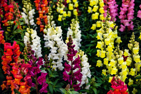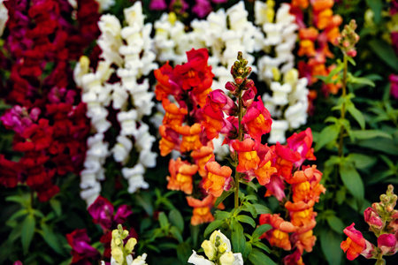 Colorful snapdragon flowers with green leaves blooming in a bright outdoor garden
