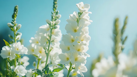 A close-up portrait showcasing white snapdragon flowers in full bloom, set against a clear, light blue sky. The sunlight highlights the petals of the blossoms.