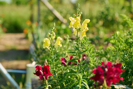 Close up of flowering plant Antirrhinum growing on raised wooden bed, watering can vegetable garden background. Summer, flowers, blossom, nature, gardening concept
