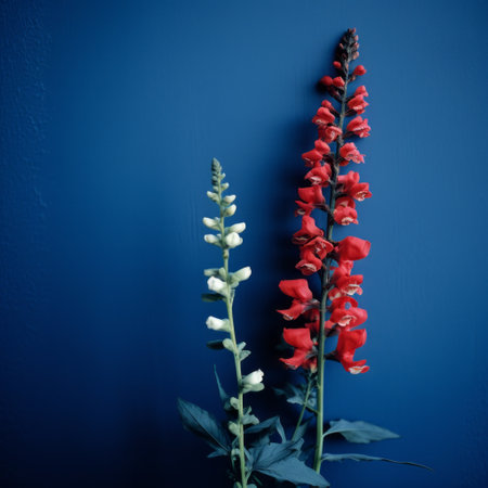 echinacea flower with red petals stands out against a blue backdrop, created by a blue wall color. the photograph captures the essence of renaissance-inspired chiaroscuro, with its organic sculpting and dark indigo and red tones. the image showcases stark honesty and simplified compositions, making it a captivating installation-based piece. shot with a fujifilm x-t4 camera. ai generated