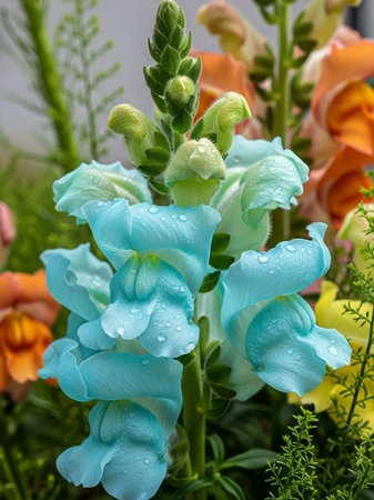 Rain drops on colorful snapdragon flowers in the garden on rainy day.