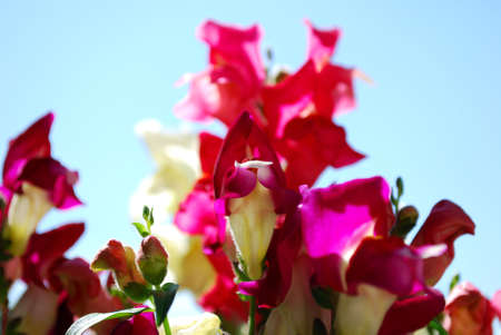 A vibrant display of snapdragon flowers in various colors against a dreamy blue sky backdrop during a sunny day
