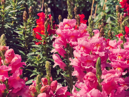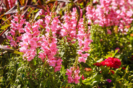 Pink flowers in the garden called Snapdragon or Antirrhinum majus or Bunny rabbits. Pink antirrhinum or dragon flowers or snapdragons in the outdoors. Pink flowers.