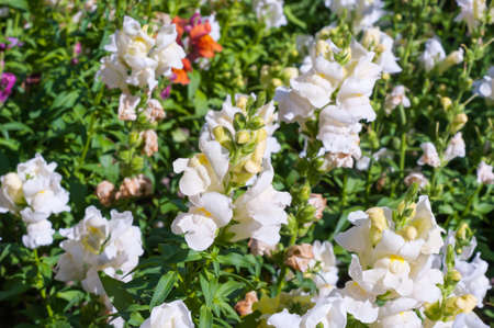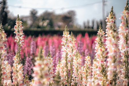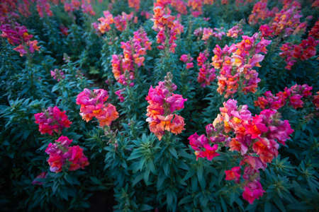 Beautiful blooming sea of snapdragon flowers of various colors in the garden