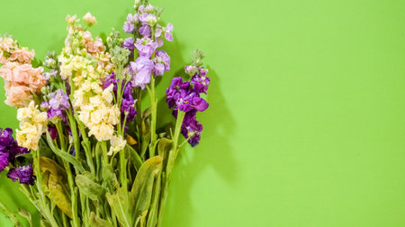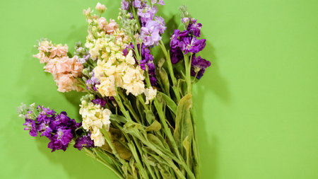 A single fresh bouquet featuring soft pink, yellow, and purple flowers rests upright on a bright green background. The stems are slightly fanned.